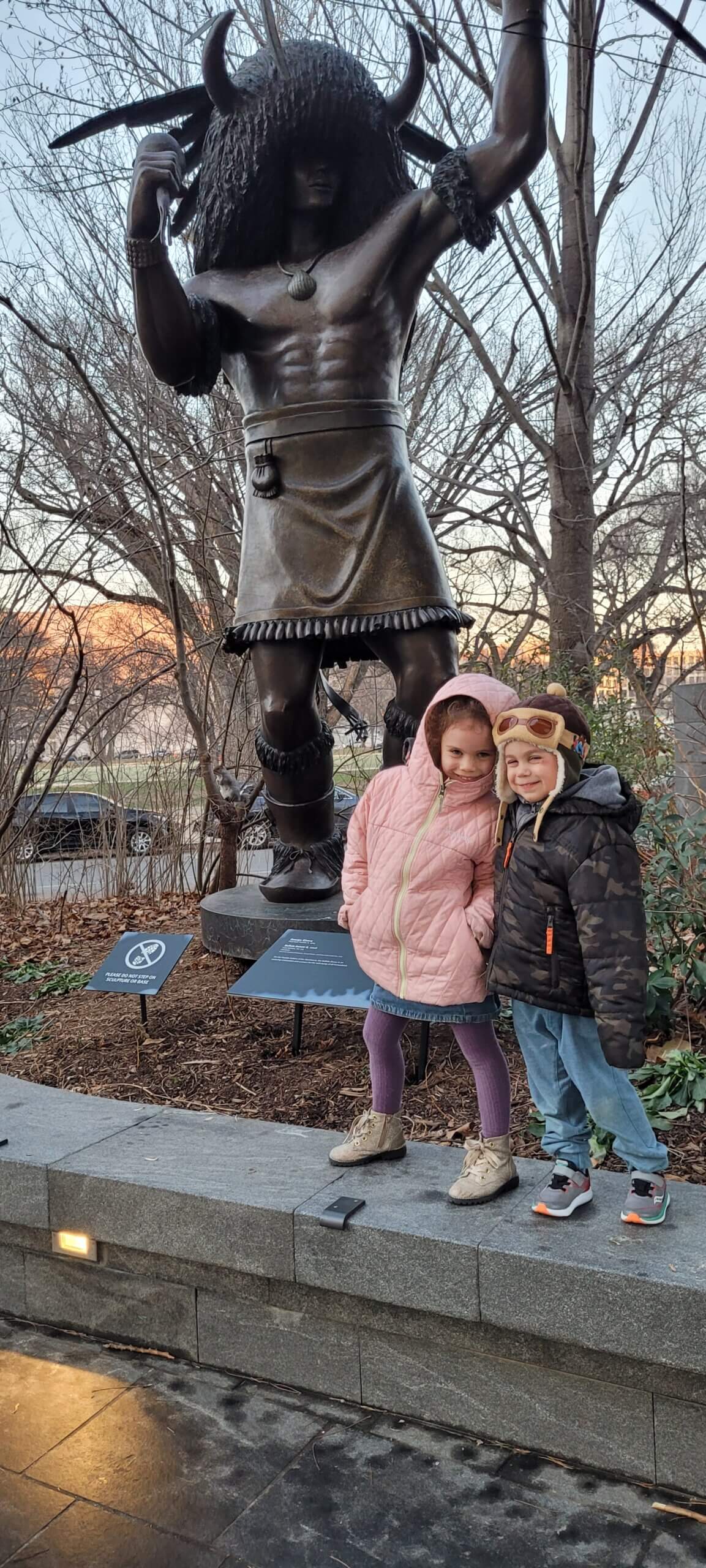 יצאנו מוקסמים לעבר השדרה המרכזית. תכננו להגיע למוזיאון האינדיאנים. התחלנו ללכת עם הילדים, רז נרדם בעגלה. עברנו דרך גבעת הקפיטול וממנה על הרחוב המרכזי. כשהגענו למוזיאון התרשמנו מהגודל העצום ומהאדריכלות המדהימה אבל כשנכנסנו פנימה התאכזבנו. בכל קומה שהגענו אליה היו מוצגים בתפזורת, לא הבנו את הקשר בין המוצגים, לא עברנו איזה מסע בתוך המוזיאון לא סיפרו שום סיפור… (מי הם האינדאנים? מה קרה להם? מתי הכל התחיל? איזה שבטים חיו פה?) נחנו קצת מההליכה באזור קטן שמיועד לילדים (גם שם, מוצגים ומשימות לא ברורות… משימה עם ירקות ובעלי כנף שלא הבנו מה הקשר שלהם למוזיאון) יצרנו כוכב צבעוני מגזרי נייר ויצאנו לדרך – היעד: אנדרטת וושינגטון.